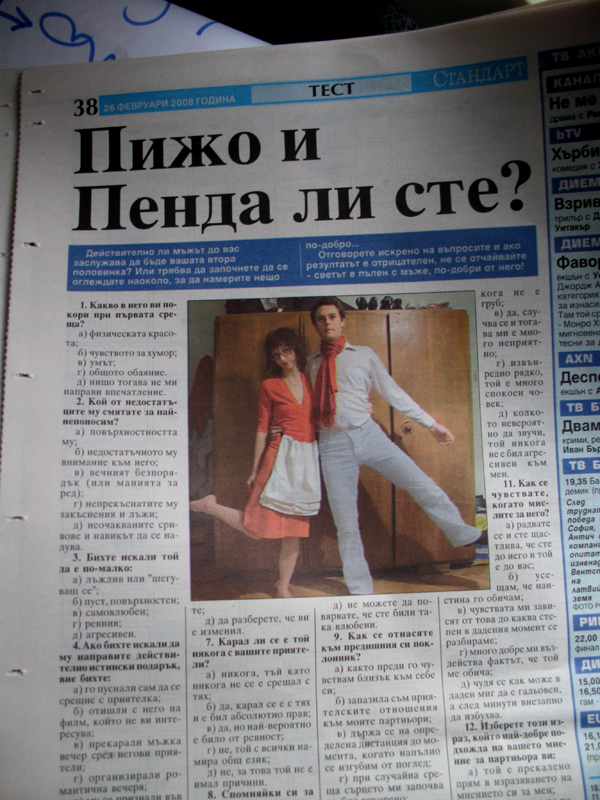 На 38-а страница в днешния брой (26 Февруари, 2008) на в-к Стандарт откривам тест на тема „Пижо и Пенда ли сте?“. Странен въпрос, казвам си. След което забелязвам, че за илюстрация на теста е използвана фотография на моя милост и съпруга ми. Фотография, чийто източник не е посочен.