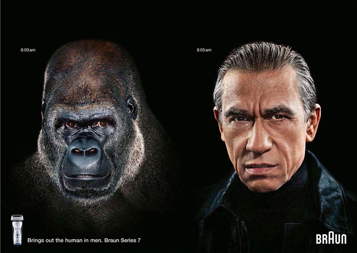 Да помислим заедно какво е посланието на кампанията. Ами… много ясно… мъжете са животни, диви същества. С малко усилия могат да се поприведат в „човешки вид“, но всъщност там под козината си не са много по-различни от нашите далечни роднини, човекоподобните маймуни.